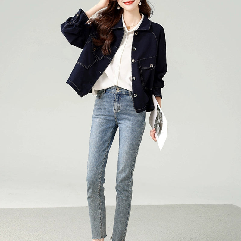 中綿入りショートデニムジャケット|カジュアル 保温アウター(HU298)