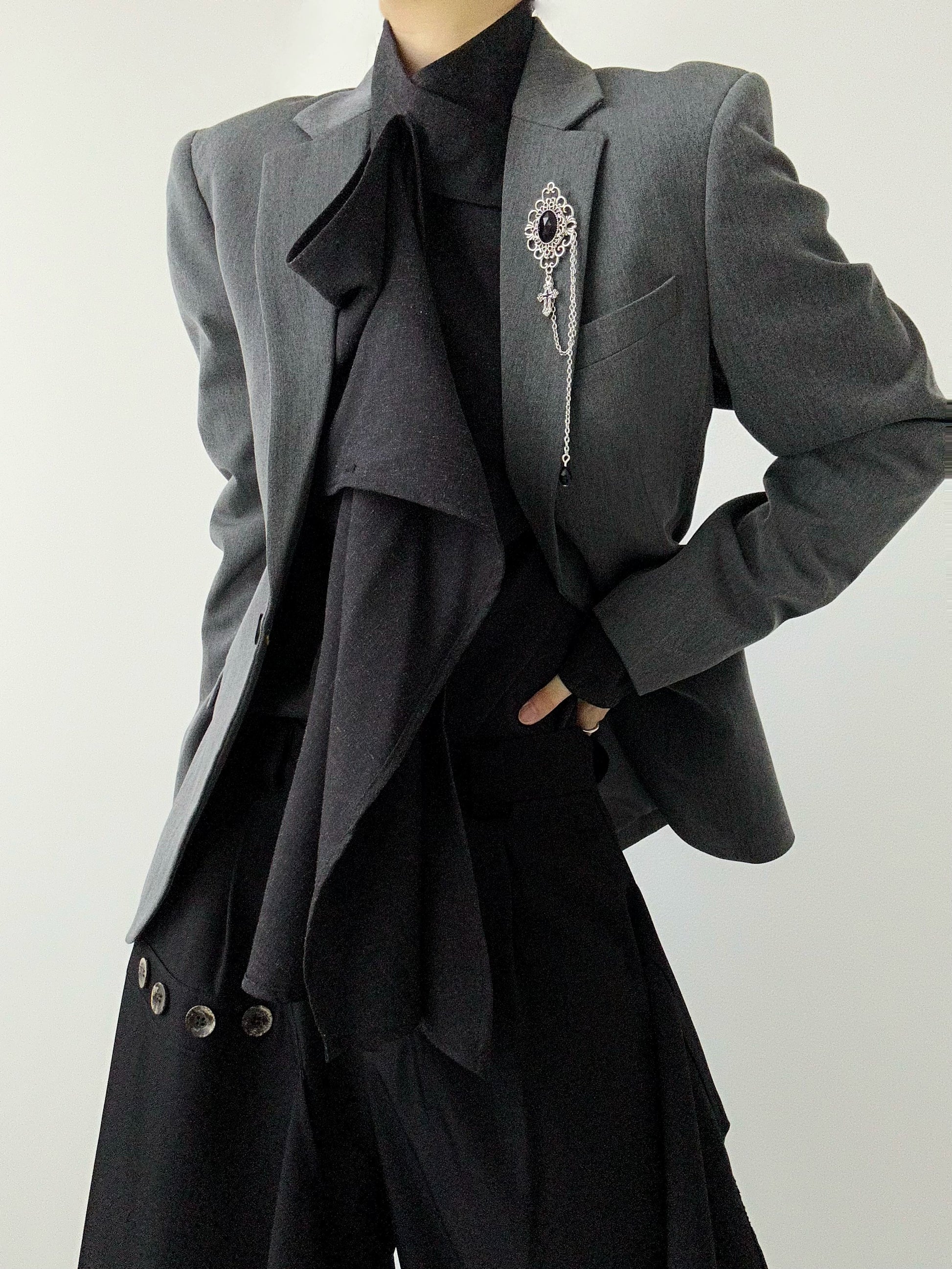 程よいハリと落ち感のある生地で、身体のラインをきれいに見せる修身シルエット。男女中性スタイルで、フォーマルにもストリートにも馴染む1枚です。