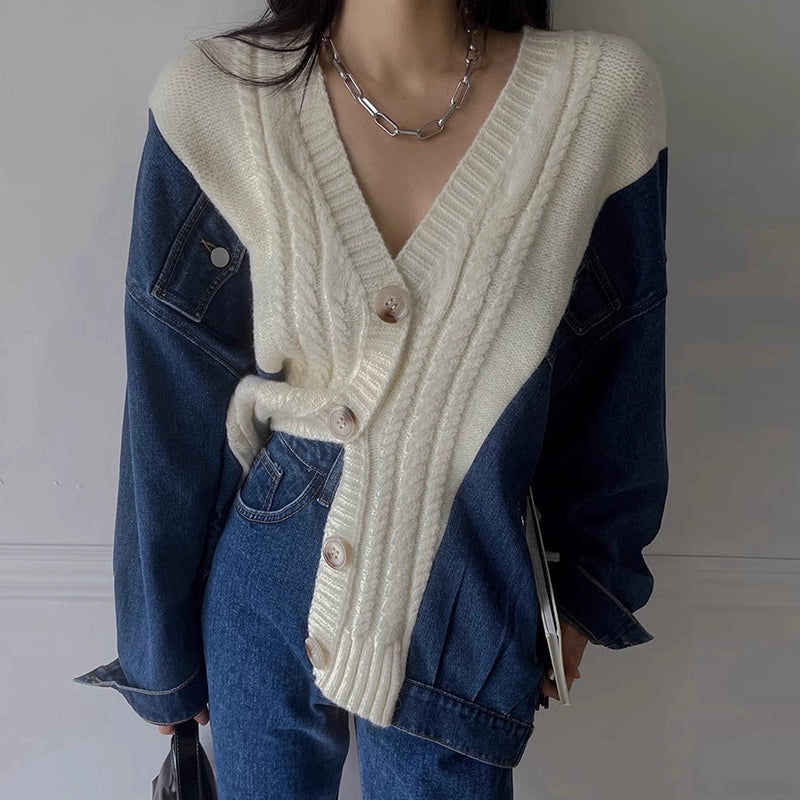 ケーブル編みニットとデニム素材を大胆に組み合わせたデザインカーディガン。Vネックとゆったりした身幅で、羽織るだけで抜け感のあるスタイルに。トレンドの異素材ミックスを1枚で楽しめるアイテム。