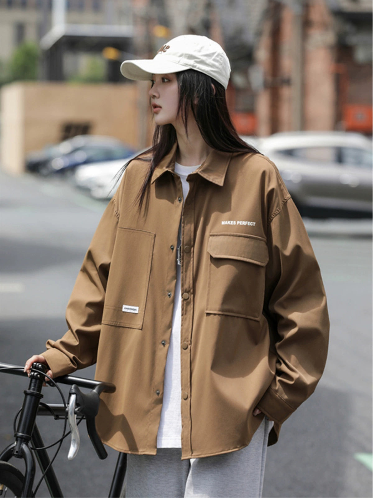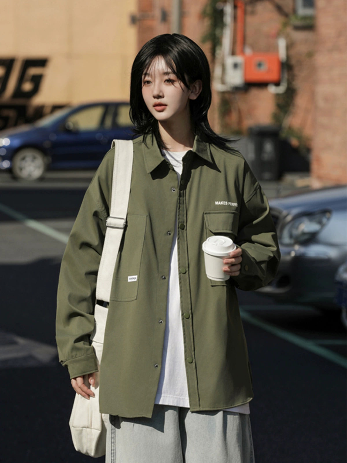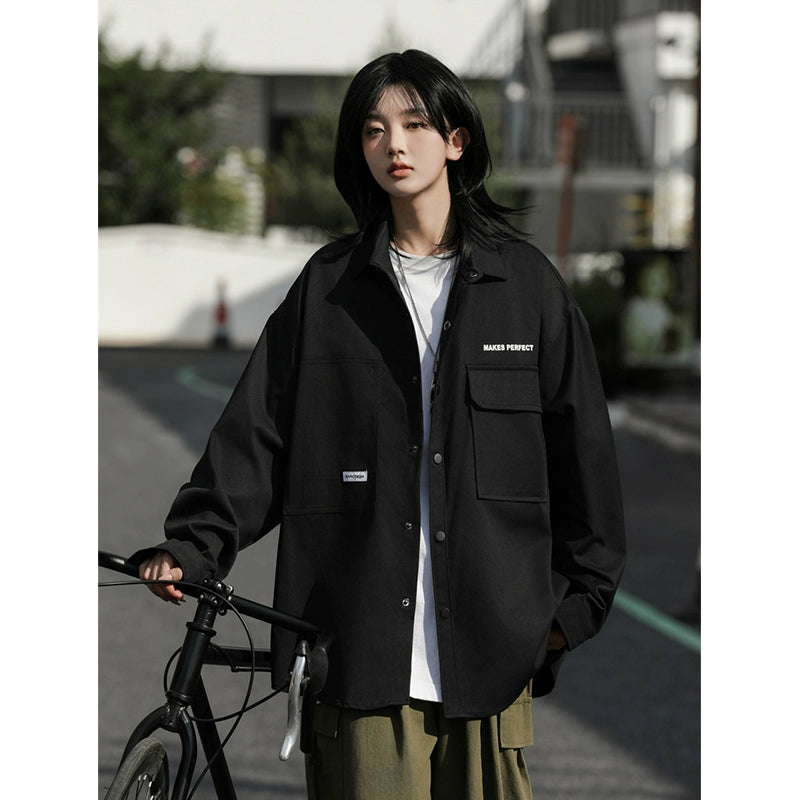 ゆったりシルエットで季節問わず使える日系ワークシャツジャケット。厚手すぎず軽やかな着心地で、羽織としてもインナーとしても使える万能アイテム。ポケットデザインが立体感を出し、シンプルながらも洗練されたストリート×ワーク感を演出。男女兼用で、カップルコーデや韓国風コーデにも相性抜群。