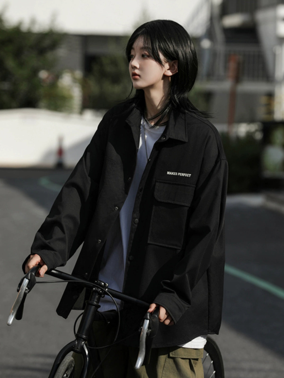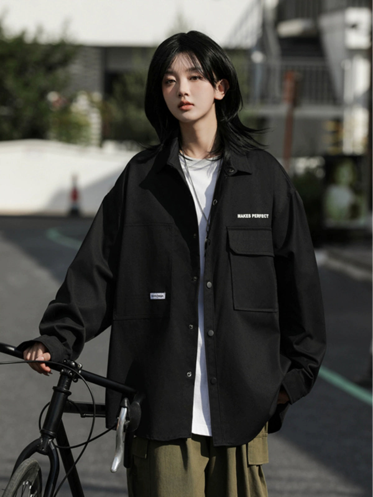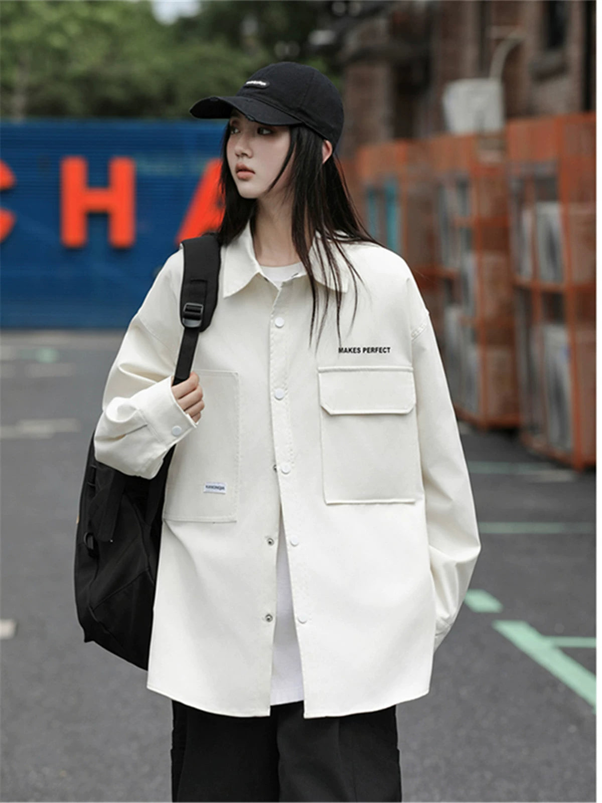 ゆったりシルエットで季節問わず使える日系ワークシャツジャケット。厚手すぎず軽やかな着心地で、羽織としてもインナーとしても使える万能アイテム。ポケットデザインが立体感を出し、シンプルながらも洗練されたストリート×ワーク感を演出。男女兼用で、カップルコーデや韓国風コーデにも相性抜群。