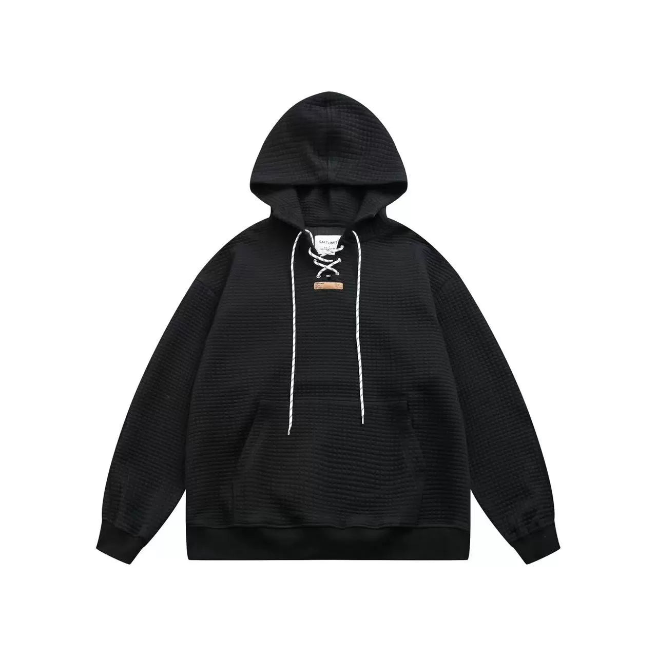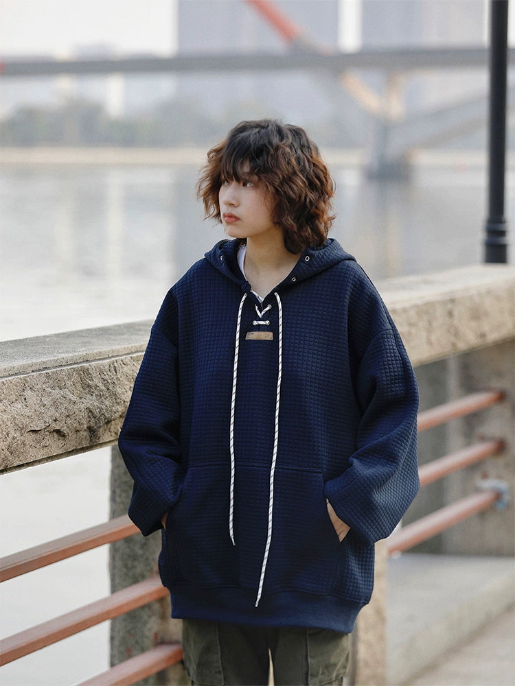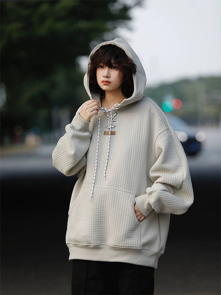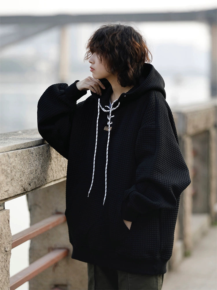 柔らかく厚みのある華夫格ワッフル生地を使用し、秋冬に最適な高保温の加厚フーディー。ゆったりとしたオーバーサイズシルエットで男女問わず着用可能。胸元はレースアップ仕様でデザイン性が高く、カジュアルにもストリートにも合わせやすい1着。