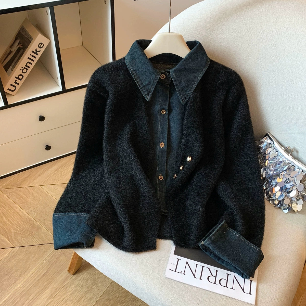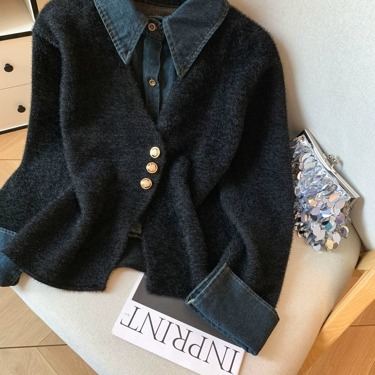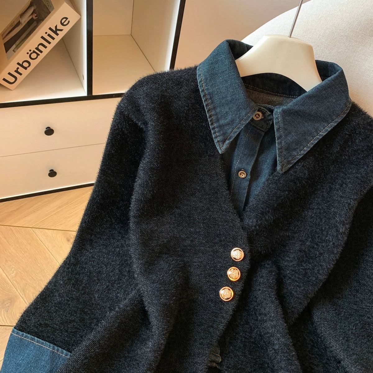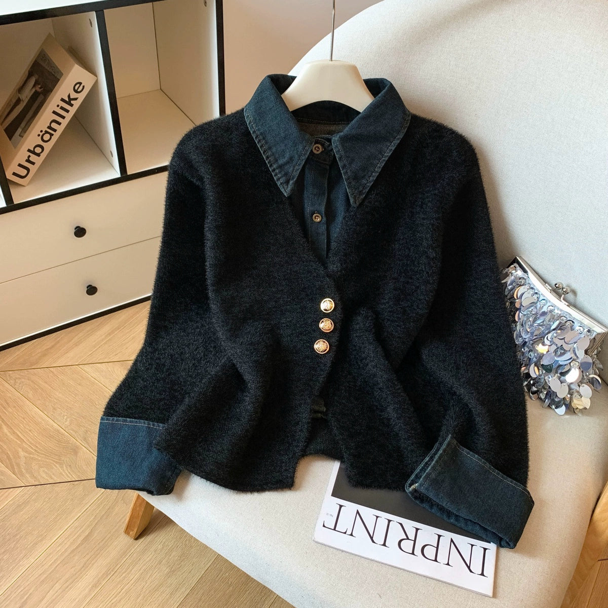 柔らかくふんわりした風合いのニットに、デニム調の襟と袖口をドッキングしたフェイクレイヤードデザイン。小香風の上品さとカジュアルさを兼ね備えた一枚で、1枚でも重ね着風のコーデが完成します。ソフトな肌触りで保温性も高く、秋冬のデイリー使いに最適。