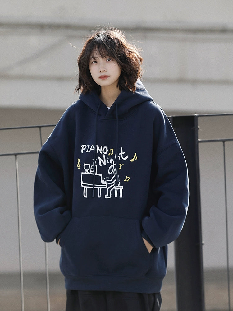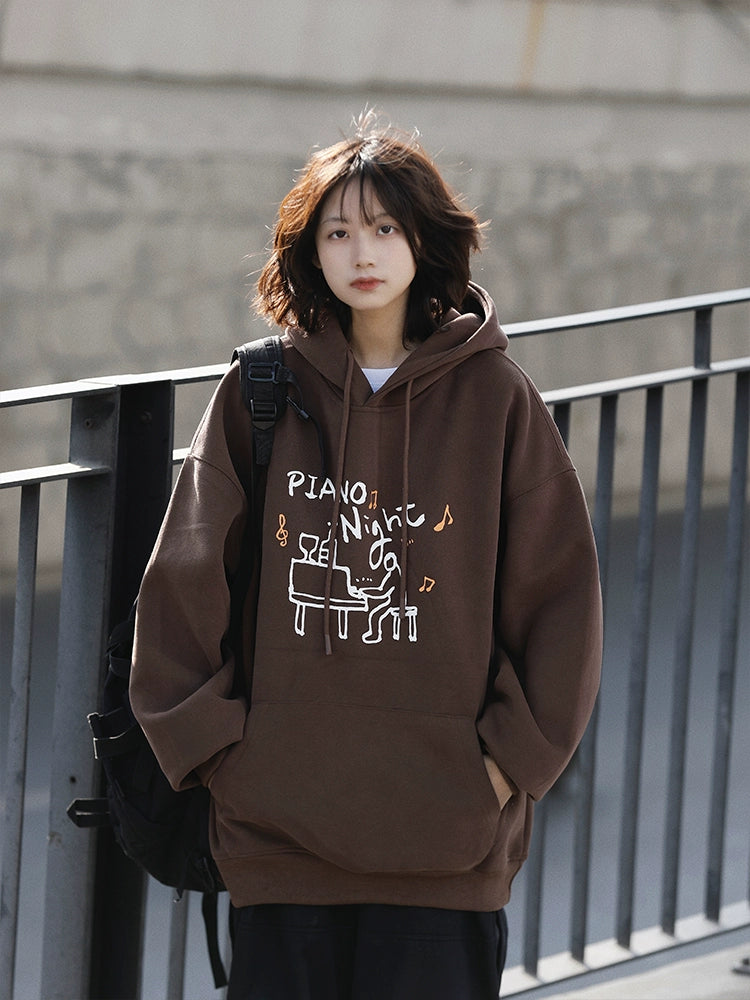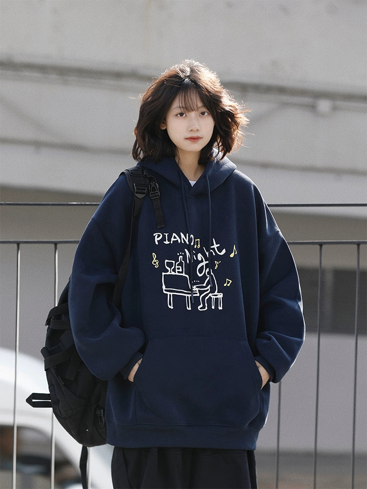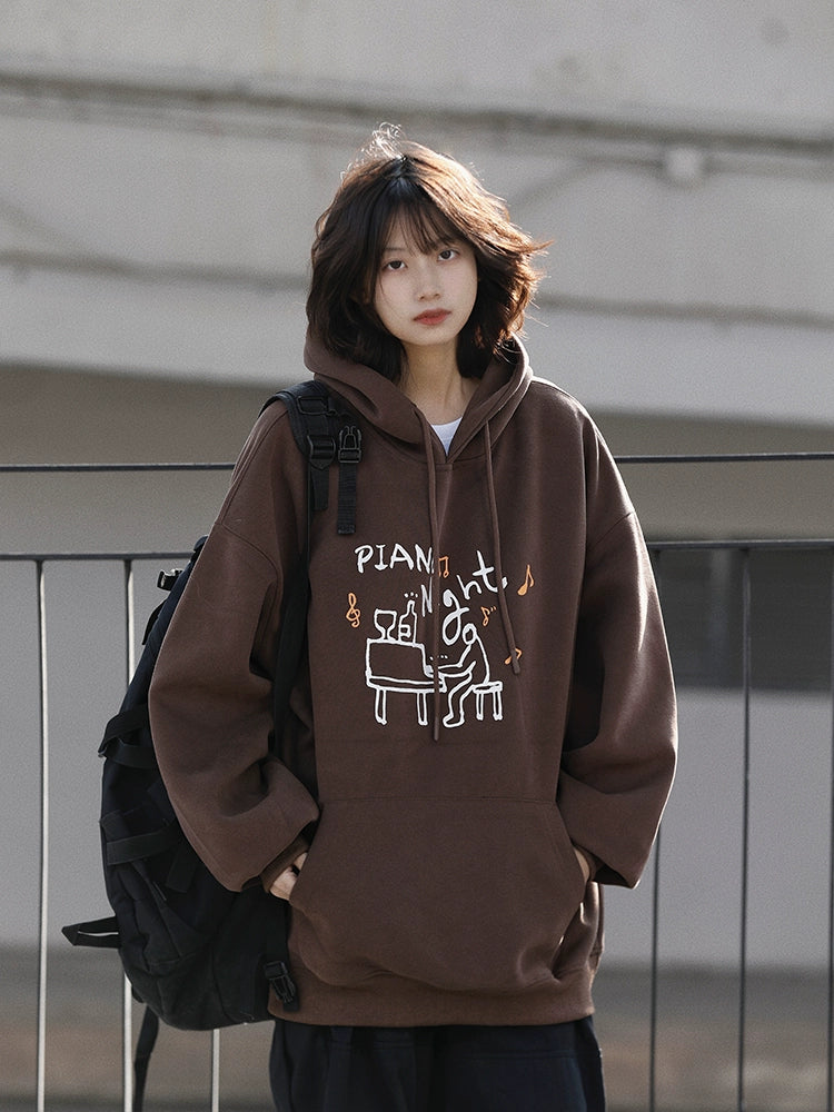460gのヘビーウェイト生地を使用した、アメリカンヴィンテージ調のユニセックスフーディ。胸元のピアノ&ナイト柄プリントが特徴で、ゆったりとした抜け感シルエットが体型を選ばず着用可能。裏起毛で保温性が高く、秋冬のデイリーからストリートまで幅広く活躍する一着。