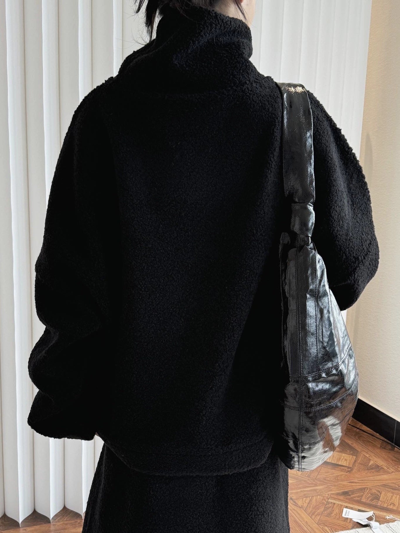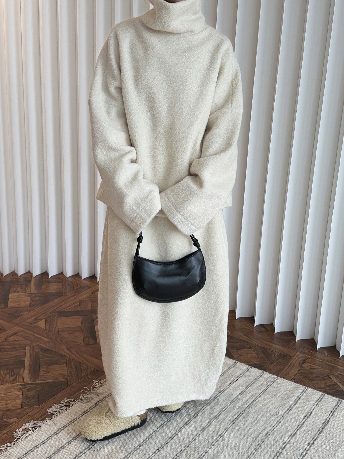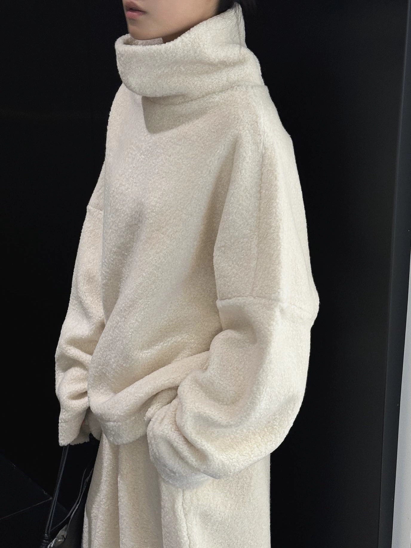 ふわふわの羊羔毛素材で抜群の保温力。立体的な極太タートルネックが小顔効果&モード感を演出。ゆったり大版シルエットで体型カバーも完璧。冬のワンマイル・街ブラ・デイリーに万能な一枚。